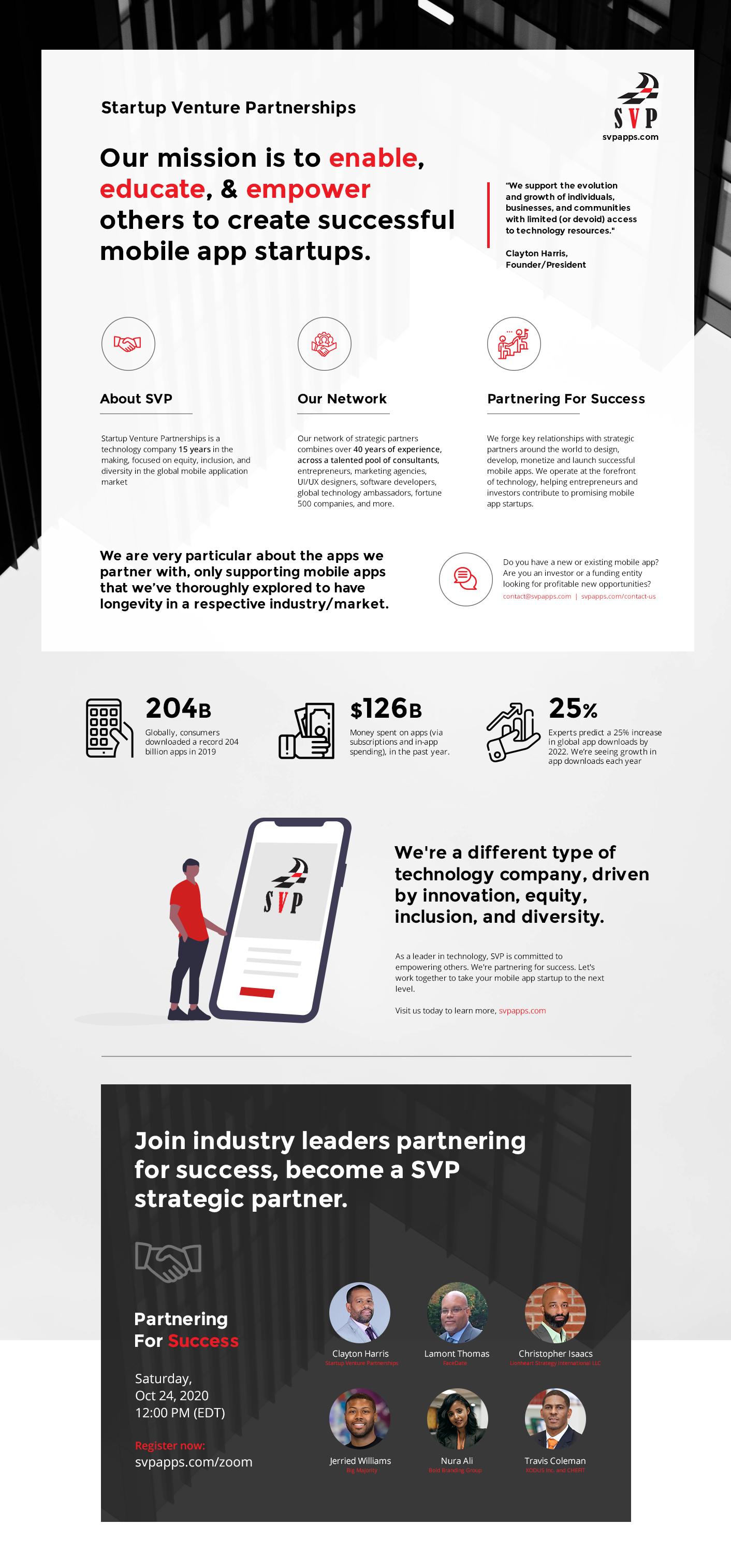 This is an opportunity to learn more about SVP and our strategic partners. If you’re a business owner, or thinking of starting a new business; maybe you’re interested in mobile apps, or just want to support diversity in tech, thank you for your continued support. Learn more at svpapps.com